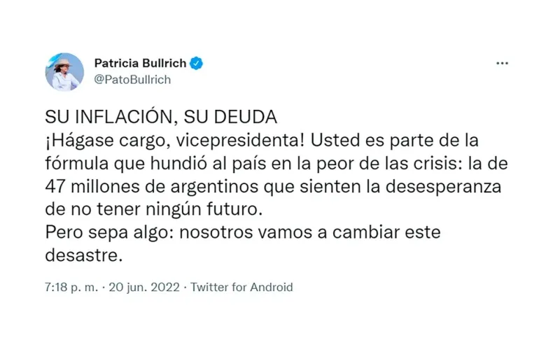"SU INFLACIÓN, SU DEUDA ¡Hágase cargo, vicepresidenta! Usted es parte de la fórmula que hundió al país en la peor de las crisis: la de 47 millones de argentinos que sienten la desesperanza de no tener ningún futuro. Pero sepa algo: nosotros vamos a cambiar este desastre", fue el mensaje entero que publicó Bullrich.