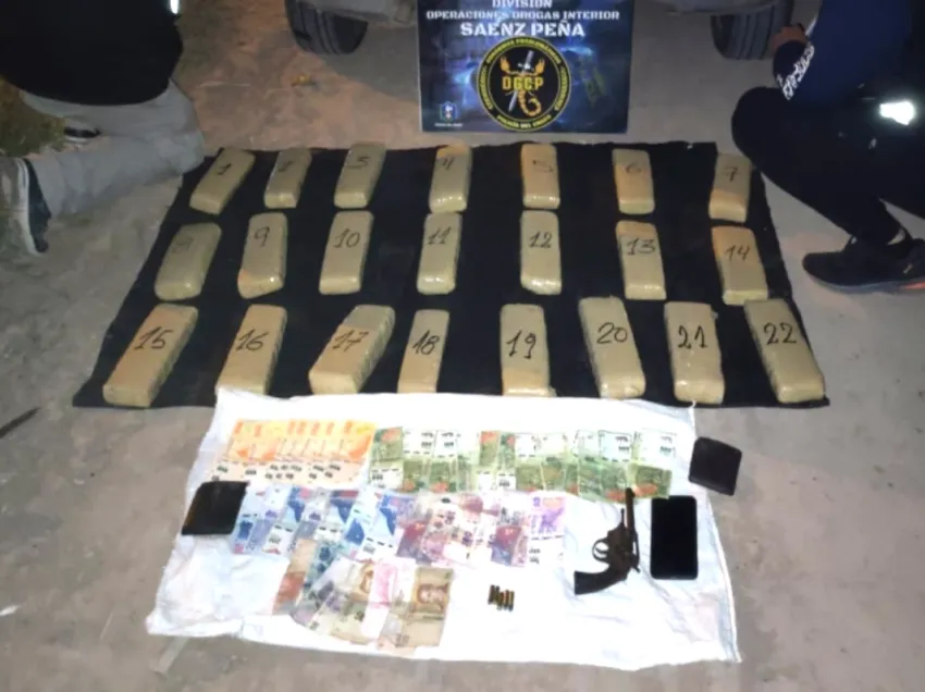 Como resultado del hecho, un hombre de 34 años oriundo de Formosa y otro de 32 proveniente de Campo Largo terminaron detenidos. En este sentido, tenían en su poder un arma de fuego tipo revólver, calibre 22, cargado con ocho cartuchos, dinero por la suma de $15.920 y la bolsa arpillera blanca que en su interior tenían 22 envoltorios con forma de ladrillo conteniendo Marihuana, arrojando un peso de 17 kilos 702 gramos.