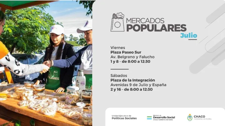 El Ministerio de Desarrollo Social iniciará julio con cuatro fechas de Mercados Populares en el área Metropolitana de Resistencia. Allí se podrán adquirir productos frescos de primera calidad y a precios promocionales. Carnes, pescados, panificados, frutas, verduras, lácteos, conservas y hasta 70 productos elaborados por unidades productivas provinciales.