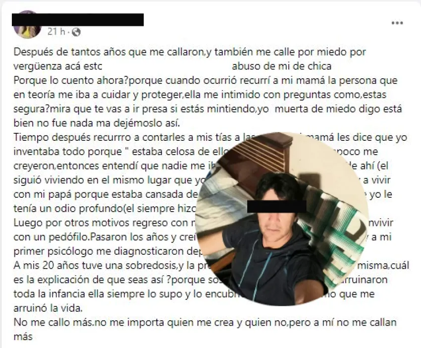 "Después de tantos años que me callaron y también calle por miedo, por vergüenza, aca estoy", comenzó el posteo de la chica en su red social. Allí comenta que cuando ocurrió el hecho recurrió a su mamá: "La persona que me iba a cuidar y proteger me intimidó con preguntas". "Mira que si mentís vas a ir presa", le habría dicho.