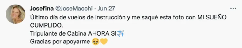 La joven fue rechazada en la entrevista por lo que decidió continuar con su trabajo de secretaria, hasta que finalmente en las ultimas horas volvió a utilizar su cuenta de Twitter para compartir la feliz noticia de que a partir del próximo domingo comenzará a trabajar en una aerolínea low cost.