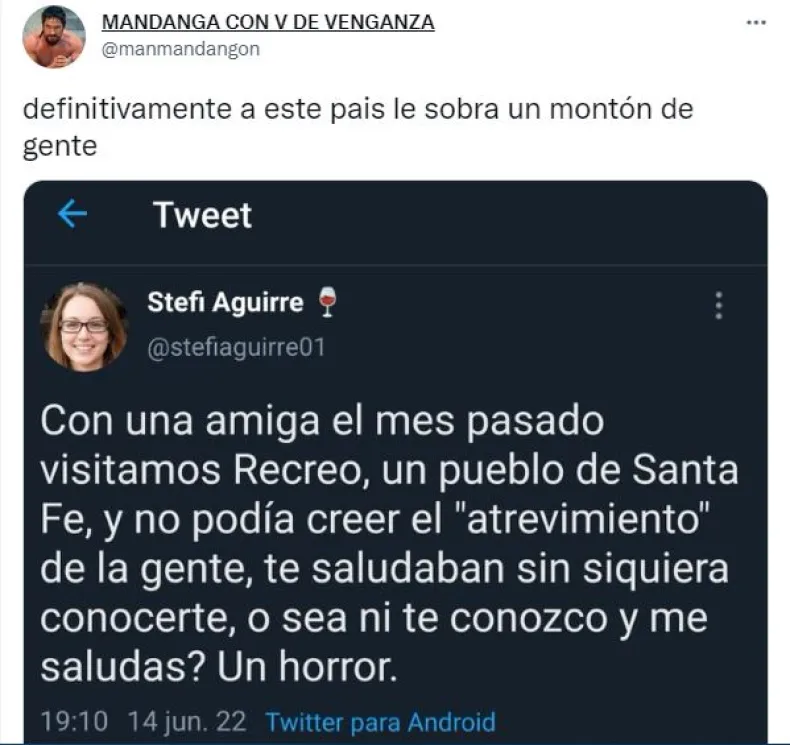 Stefanía Aguirre decidió contar en su cuenta de Twitter "@stefiaguirre01" que personas desconocidas la saludaban, lo que le pareció un error. "Con una amiga el mes pasado visitamos Recreo, un pueblo de Santa Fe, y no podía creer el 'atrevimiento' de la gente, te saludaban sin siquiera conocerte, o sea ni te conozco y me saludás? Un horror", manifestó.