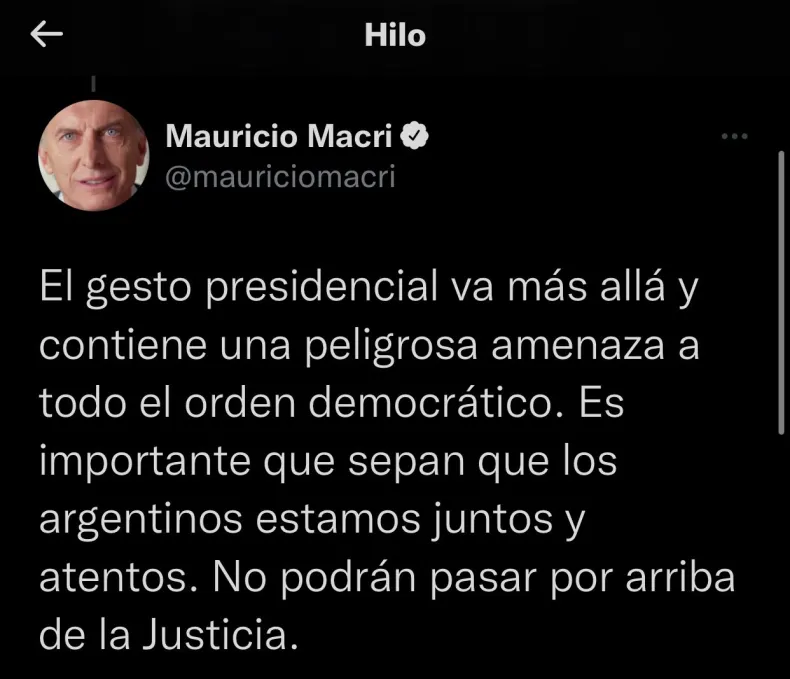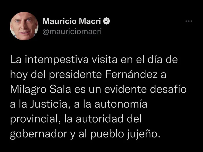 Luego de que el jefe de Estado se mostrara con ella y advirtiera que su prisión es irregular, Macri advirtió este miércoles que el gesto de Fernández es un desafío a la Justicia, al gobernador y al pueblo de Jujuy. "El gesto presidencial va más allá y contiene una peligrosa amenaza a todo el orden democrático. Es importante que sepan que los argentinos estamos juntos y atentos. No podrán pasar por arriba de la Justicia", analizó el líder del Pro en su cuenta de Twitter.