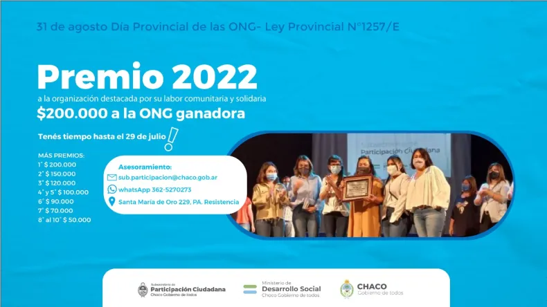 El Ministerio de Desarrollo Social abrió la convocatoria para participar del Premio Provincial a la ONG Destacada por su Labor Comunitaria y Solidaria Año 2022, a través de la cual se otorga estímulos económicos a las organizaciones seleccionadas. El primer premio para la organización elegida será de 200 mil pesos.
