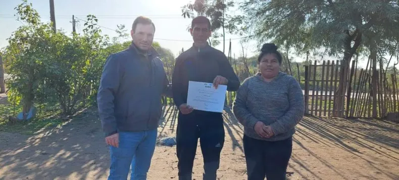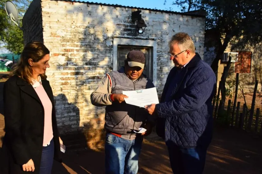 El intendente Pio Sander, acompañado de la presidenta de Concejo Deliberante, Soledad Rach, el secretario de Gobierno, Ismael Pablo Barnes, y coordinadores, en recorrida puerta a puerta, hicieron entrega de los certificados a los beneficiarios.