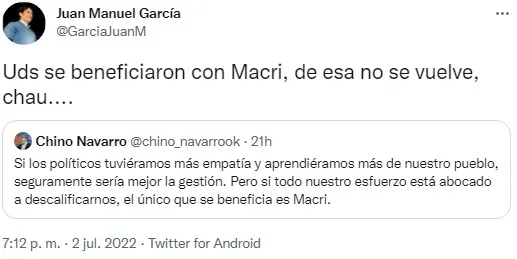 Anteriormente, el jefe comunal de Machagai había citado una publicación de Fernando "Chino" Navarro, afirmando: "Uds se beneficiaron con Macri, de esa no se vuelve, chau...."