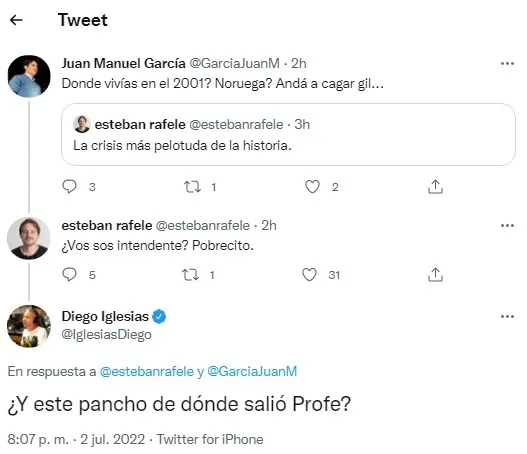 Rafele es integrante del programa radial Mejor País del Mundo en Radio Con Vos y escribe en El Cronista, y había tuiteado en pleno discurso de la vicepresidenta: "La crisis más pelotuda de la historia". García recogió el guante, citó el tuit y agregó: "Donde vivías en el 2001? Noruega? Andá a cagar gil...". Este intercambio fue contestado también por el ex notero de Caiga Quien Caiga, Diego Iglesias: "¿Y este pancho de dónde salió Profe?", saltando en favor del periodista.
