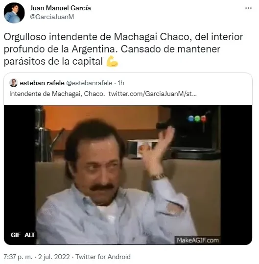 "¿Vos sos intendente? Pobrecito", replicó Rafele, a lo que García respondió: "Si che, y vos sos trol o periodista? Jaja", y añadió: "Orgulloso intendente de Machagai Chaco, del interior profundo de la Argentina. Cansado de mantener parásitos de la capital".
