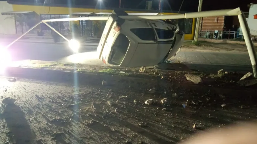 Un hombre perdió el control de su auto, chocó un poste de luz y terminó volcando
