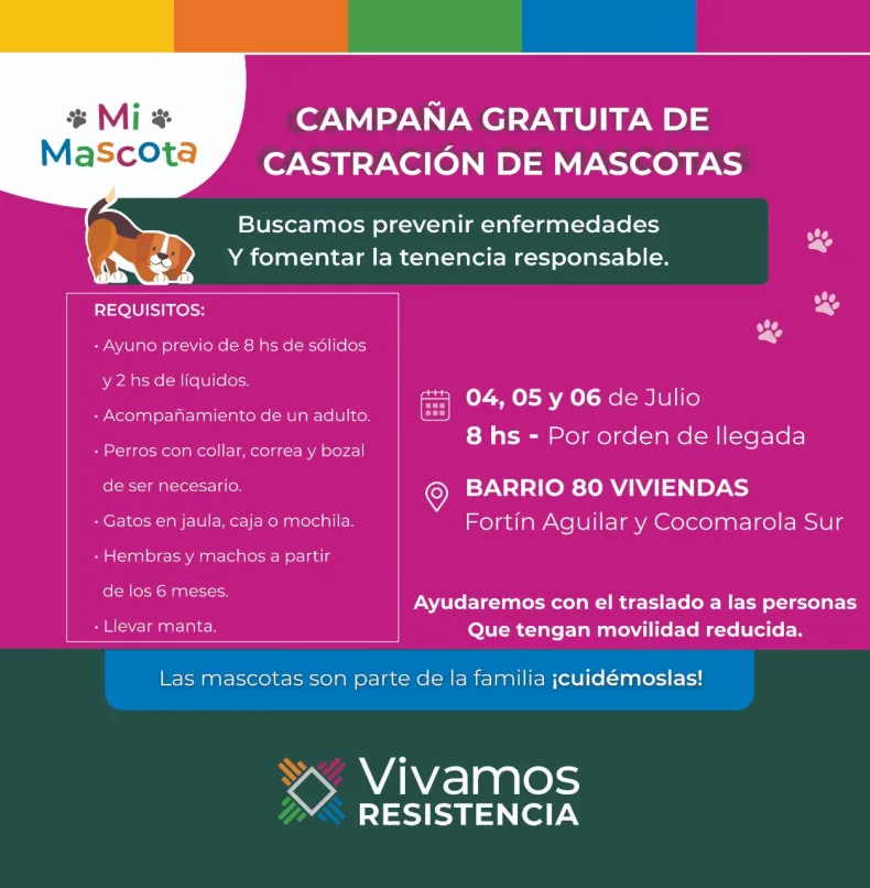 Este martes 5 y miércoles 6 de julio continuará en el barrio 80 Viviendas el programa de castración gratuita de mascotas que el municipio de Resistencia lleva adelante en toda la ciudad mediante la disponibilidad del quirófano móvil que comienza a atender a partir de las 8, por orden de llegada.