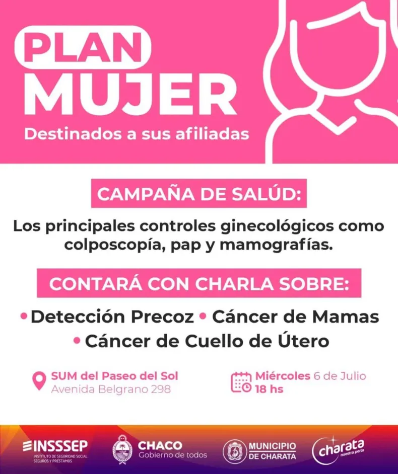 El Plan Mujer del INSSSEP se presentará este miércoles desde las 18 en el SUM del Paseo del Sol (avenida Belgrano 218) de Charata.