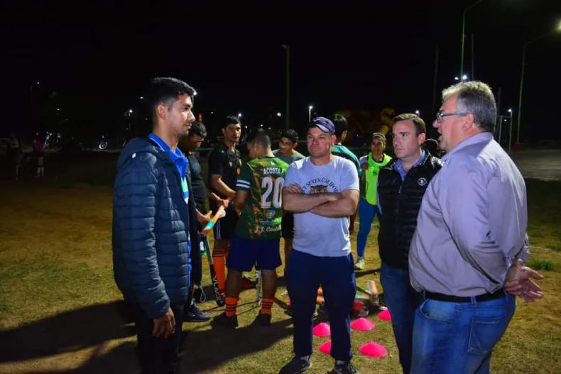 El intendente de Castelli, Pio Sander junto al secretario de Gobierno Ismael Pablo Barnes y el Subsecretario de Deportes Roberto Scheffer participaron en la tarde ayer de las prácticas deportivas de Araucano Hockey Club, en donde dialogaron con su entrenador Alexis Villalba.