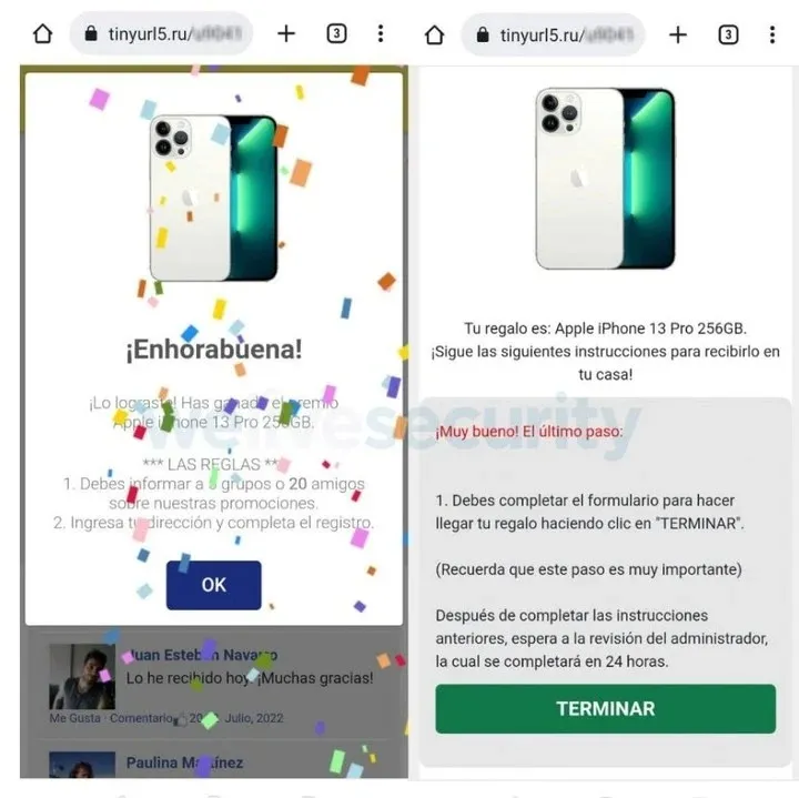 Tras anunciar el supuesto premio, la víctima es redirigida a otro sitio que utiliza técnicas de ataques conocidos como scareware, según detallan de ESET, con el objetivo de hacerle creer que su dispositivo está desactualizado y en peligro.