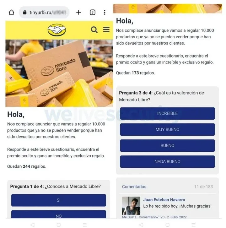 La trampa llega a las víctimas a través de un mensaje que muchas veces es replicado, de manera voluntaria, por un contacto de la agenda, y que informa sobre rifas de 10.000 elementos devueltos. Se envía un link comprimido que promete dirigir a los usuarios al sitio web oficial de MercadoLibre, que es la empresa que los ciberdelincuentes está suplantando.