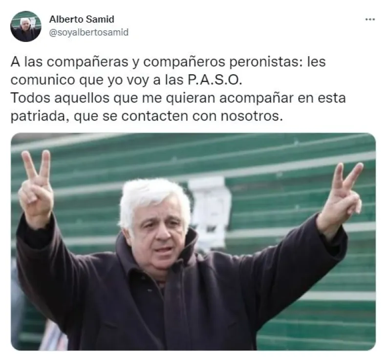 De esa manera, Samid aseguró que será candidato a presidente en las próximas elecciones Primaria, Abiertas, Simultáneas y Obligatorias (PASO). "A las compañeras y compañeros peronistas: les comunico que yo voy a las PASO. Todos aquellos que me quieran acompañar en esta patriada, que se contacten con nosotros", escribió en redes sociales.