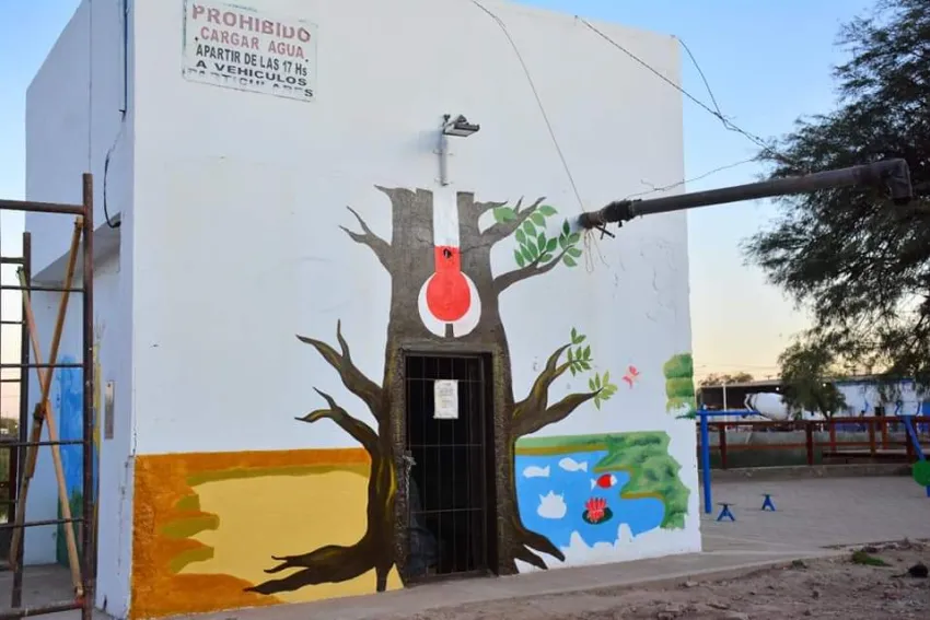 Los estudiantes del profesorado de artes visuales del IES René Favaloro realizaron un mural en el paseo de la represa La Cuadrada, donde actualmente se encuentra una jirafa para que los camiones regadores puedan cargarse de agua.