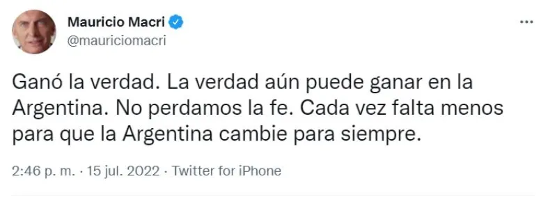El expresidente se expresó sobre la decisión en sus redes sociales:"Ganó la verdad. La verdad aún puede ganar en la Argentina. No perdamos la fe. Cada vez falta menos para que la Argentina cambie para siempre", publicó su cuenta de Twitter.