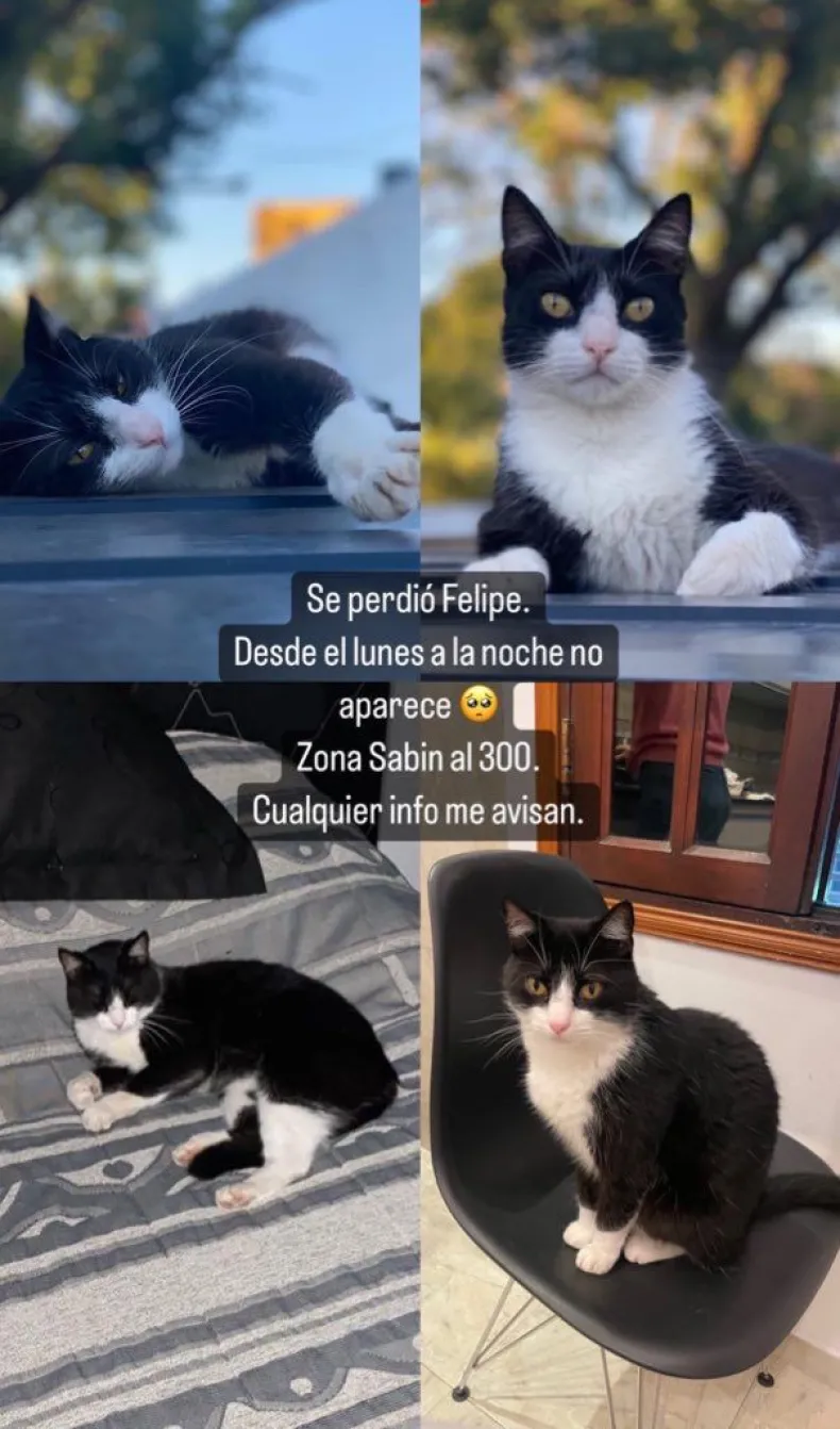 Felipe tiene 6 años, es un gato color negro con el pecho y las patas blancas, con una mancha característica negra en la pata trasera del lado derecho. Su dueña se contactó con Diario TAG para pedir difusión.