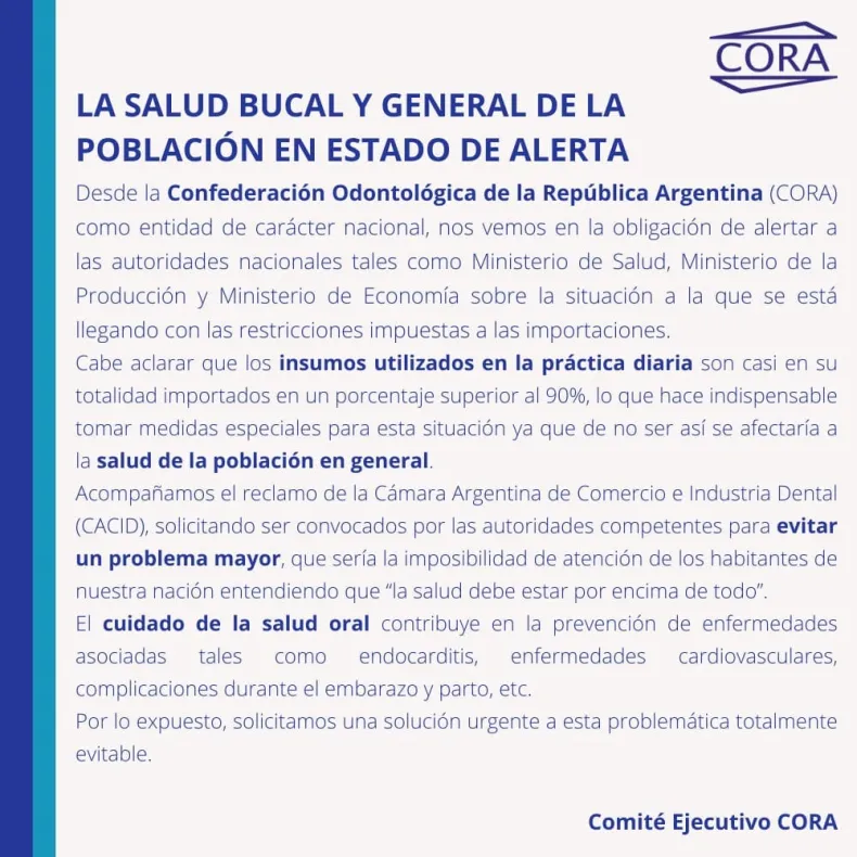 En la jornada del pasado jueves la Confederación Odontológica de la Republica Argentina (CORA) dio a conocer un comunicado la situación de los odontólogos debido a las restricciones de las importaciones.