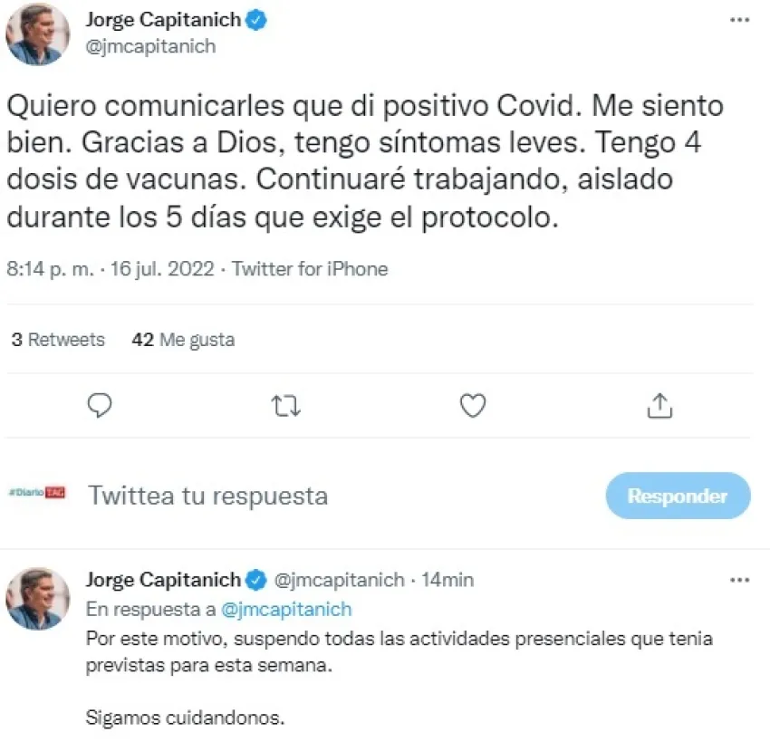 "Quiero comunicarles que di positivo Covid. Me siento bien. Gracias a Dios, tengo síntomas leves. Tengo 4 dosis de vacunas. Continuaré trabajando, aislado durante los 5 días que exige el protocolo", tuiteó.