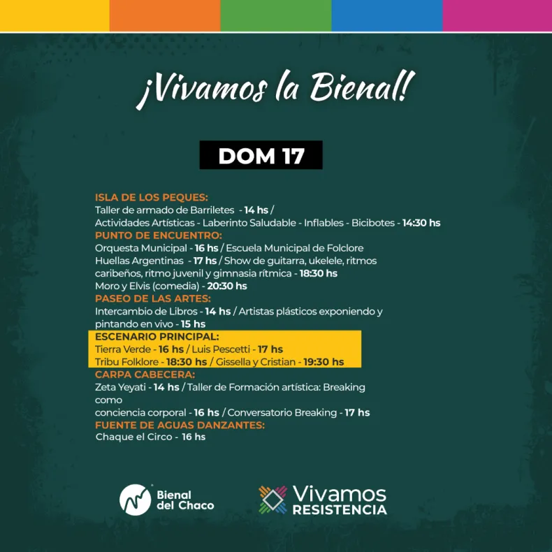 La música estará presente desde las 16 en el "Escenario Principal de la Bienal", donde "Tierra Verde" abrirá el telón y luego seguirá Luis Pescetti en el horario de las 17. A las 18:30 seguirá "Tribu Folklore" y para las 19:30 darán un espectáculo de Gissella y Cristian.