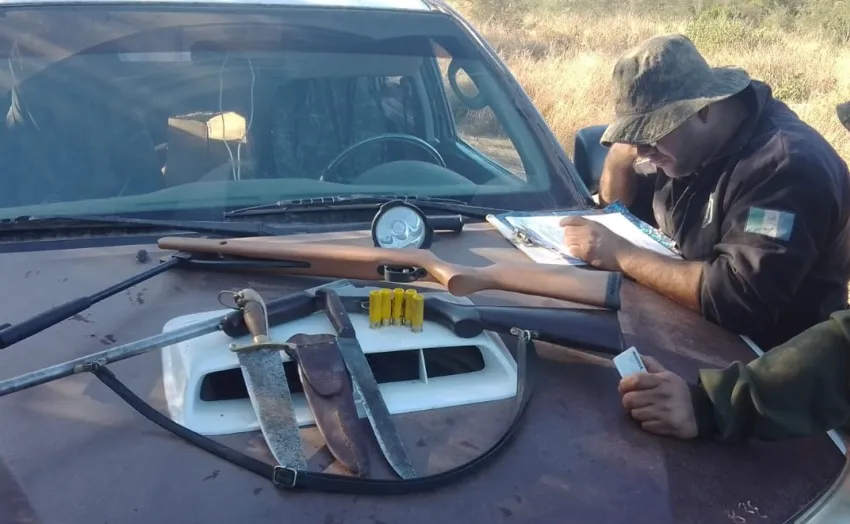 Posteriormente, detienen la marcha de una camioneta Toyota Hilux, abordada por cinco hombres de 31, 34, 37, 40 y 77 años. Estos transportaban cinco escopetas de diferente calibre, cuatro armas, blancas, varias herramientas de caza y cinco animales sin vida, (quirquincho y mulita). Estos al no contar con la documentación, los agentes procedieron al secuestro.