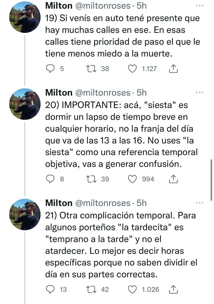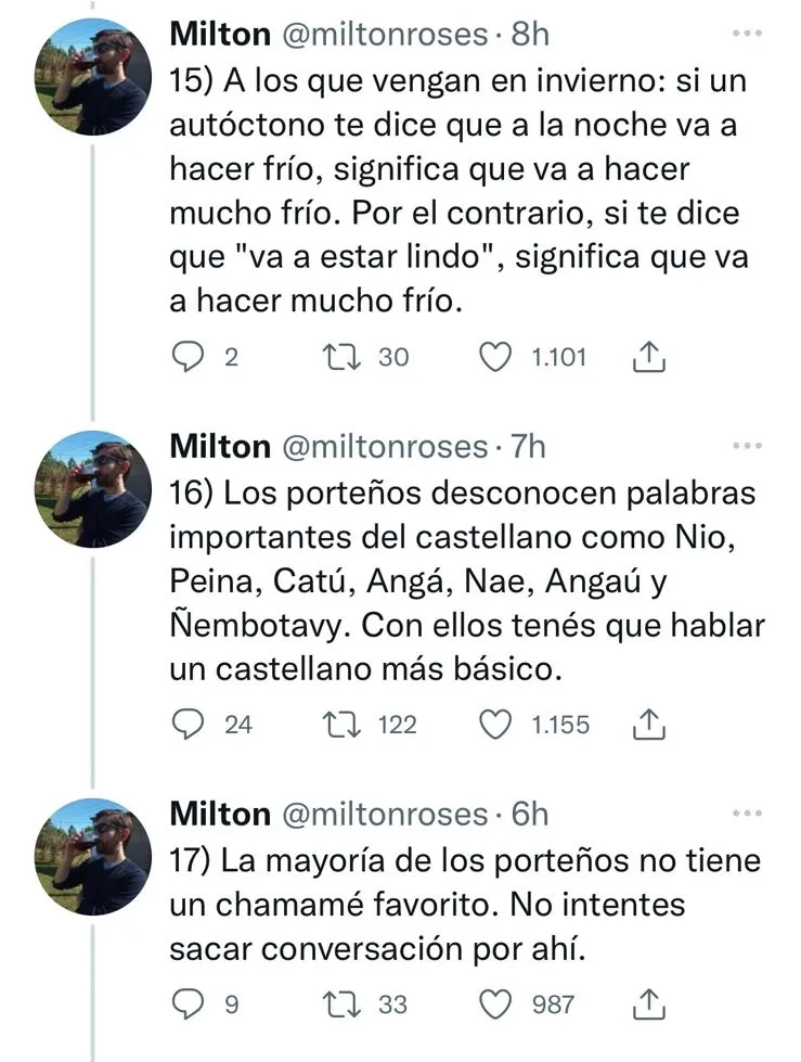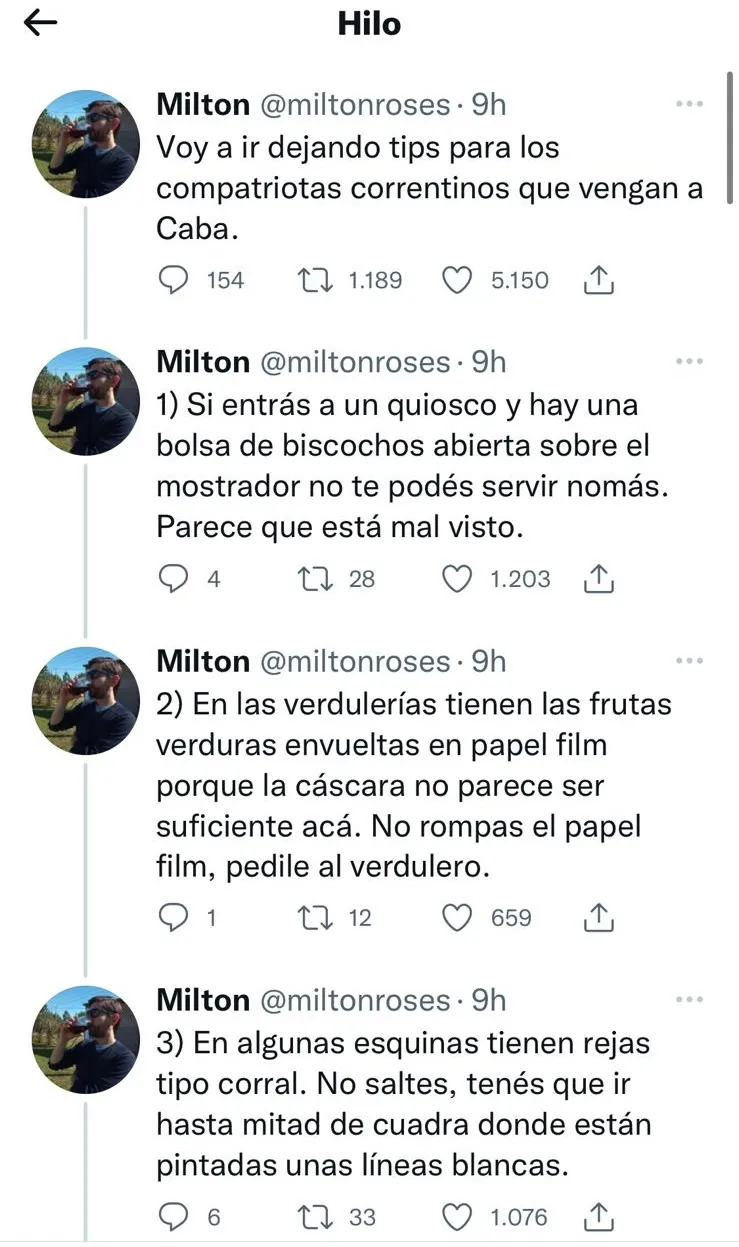 "Voy a ir dejando tips para los compatriotas correntinos que vengan a Caba", escribió. El primer consejo de Milton fue: "Si entrás a un quiosco y hay una bolsa de biscochos abierta sobre el mostrador no te podés servir nomás. Parece que está mal visto".