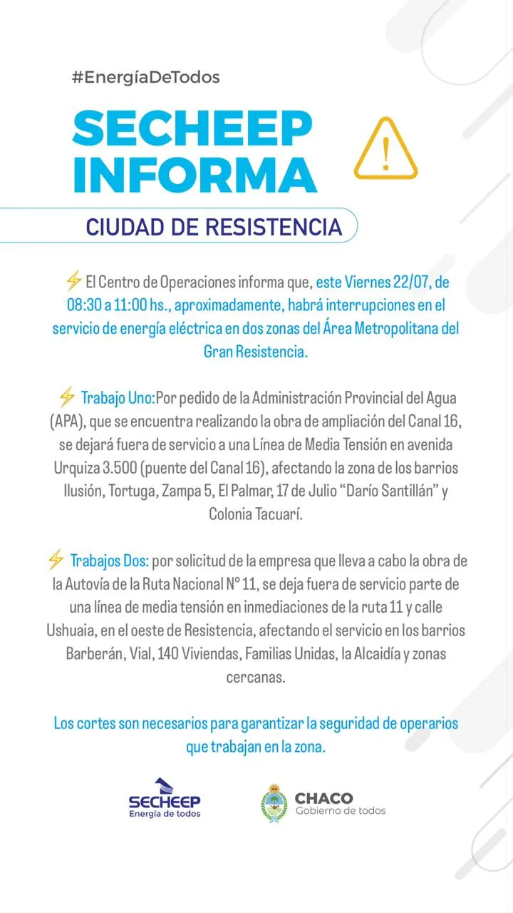 El Centro de Operaciones de Secheep comunicó que este viernes 22 de julio, de 8:30 a 11 aproximadamente, habrá interrupciones en el servicio de energía eléctrica en dos zonas del Área Metropolitana del Gran Resistencia.