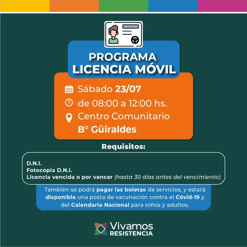 El programa "Licencia Móvil" de Resistencia arribará este sábado 23 de julio al Centro Comunitario Municipal (CCM) del barrio Güiraldes, en Soldado Aguilera 3500, donde los vecinos y vecinas podrán renovar su licencia de conducir en la proximidad de sus domicilios. Mientras que para el 30 de julio, será el turno del CCM Villa Río Negro.
