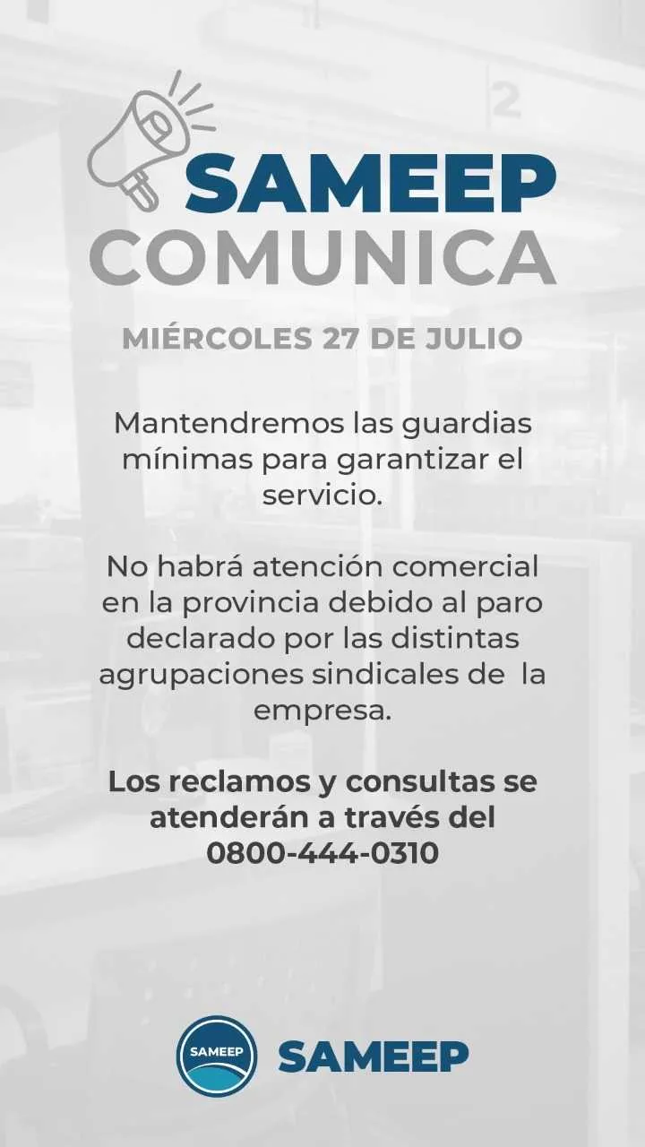 La empresa Sameep informó este martes por la tarde que durante la jornada de este miércoles 27 de julio solamente mantendrán guardias mínimas.