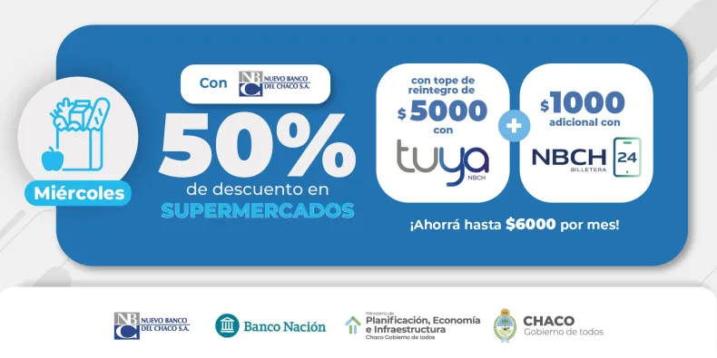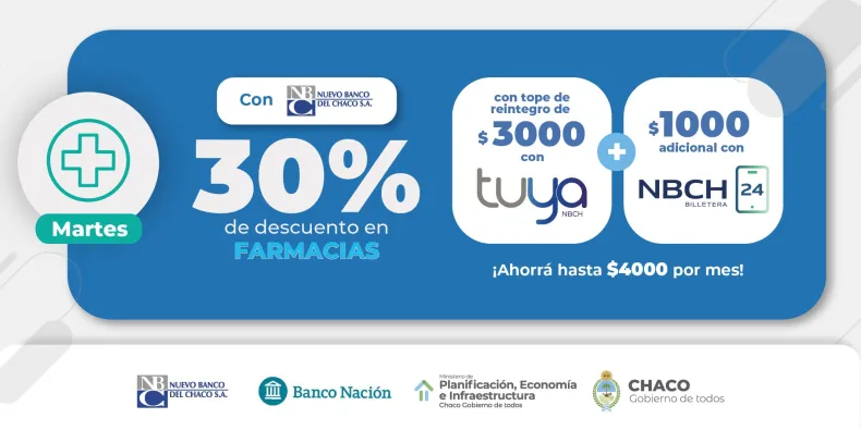 Como en las ediciones anteriores, usuarias y usuarios de la tarjeta Tuya del Nuevo Banco del Chaco podrán acceder a descuentos del 30% en farmacias los días martes y del 50% en supermercados los días miércoles del mes con un tope de reintegro de $3000 y $5000 respectivamente. Además, usando la Billetera NBCH24 se suma un reintegro con tope de $1000 en cada caso. Los descuentos podrán ser acumulativos con ambos medios de pago, representando un ahorro de $10 mil por mes.