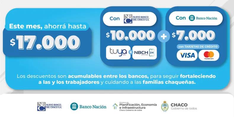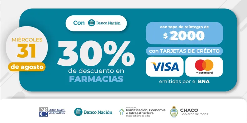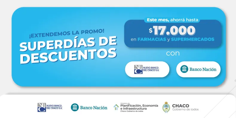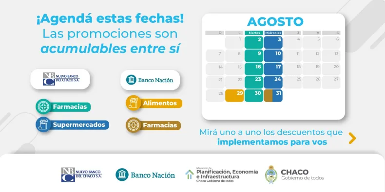 Paralelamente, se mantendrán los descuentos para chaqueñas y chaqueños que cuenten con tarjetas Visa o Mastercard emitidas por el Banco Nación. En el caso de los supermercados, la promoción será el lunes 29 de agosto con 50% de descuento, con un tope de reintegro de $5.000. Para farmacias, los beneficios serán el miércoles 31 con un descuento del 30% y un tope de reintegro $2.000. En total, se puede ahorrar hasta $7.000 con este medio de pago.