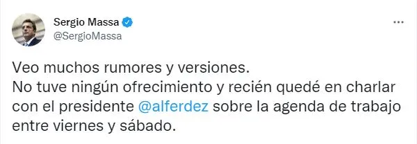 Massa utilizó su cuenta personal de Twitter para realizar la aclaración ante los reiterados rumores o versiones de que sería el nuevo ministro de Economía.