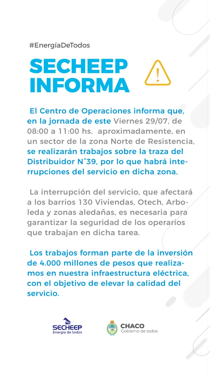 Secheep comunicó que este viernes, entre las 8 y las 11 de la mañana aproximadamente, no habrá servicio eléctrico en un sector de la zona norte de Resistencia debido a que se realizarán trabajos sobre la traza del distribuidor N°39.