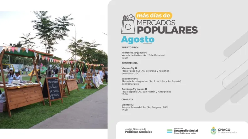 Los operativos de Mercados Populares se realizarán durante la primera quincena de agosto, empezando en Puerto Tirol, el miércoles 3 y jueves 4, a las 15, en avenida 12 de Octubre (vereda de Unitán); los viernes 5 y 12 de agosto en Plaza Paseo Sur de Resistencia (avenida Belgrano y Falucho); y los sábados 6 y 13 en Plaza de la Integración, en el límite entre la capital chaqueña con Barranqueras (avenidas 9 de Julio y España), en ambos lugares y fechas será en el horario de 8 a 12, ampliándose el domingo 7 y el jueves 11 de agosto la presencia de Mercados Populares en Plaza España de Resistencia (avenida San Martín y Ameghino), en el marco de una serie de actividades que está organizando el Poder Ejecutivo con motivo de celebrar la provincialización del Chaco, y para terminar el viernes 12 se efectuarán en Charata, en el Parque Paseo del Sol (avenida Belgrano al 200).
