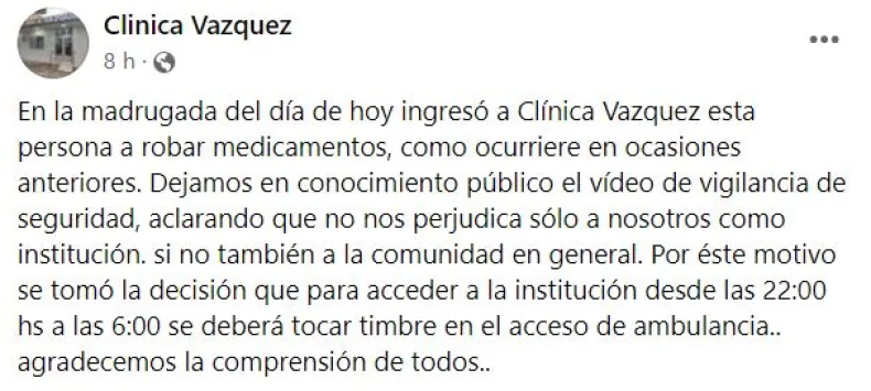 La "Clínica Vázquez", de la localidad de Juan José Castelli, denunció en sus redes sociales que una mujer ingresó al lugar durante la madrugada a robarse medicamentos, y el hecho quedó registrado por las cámaras de seguridad.