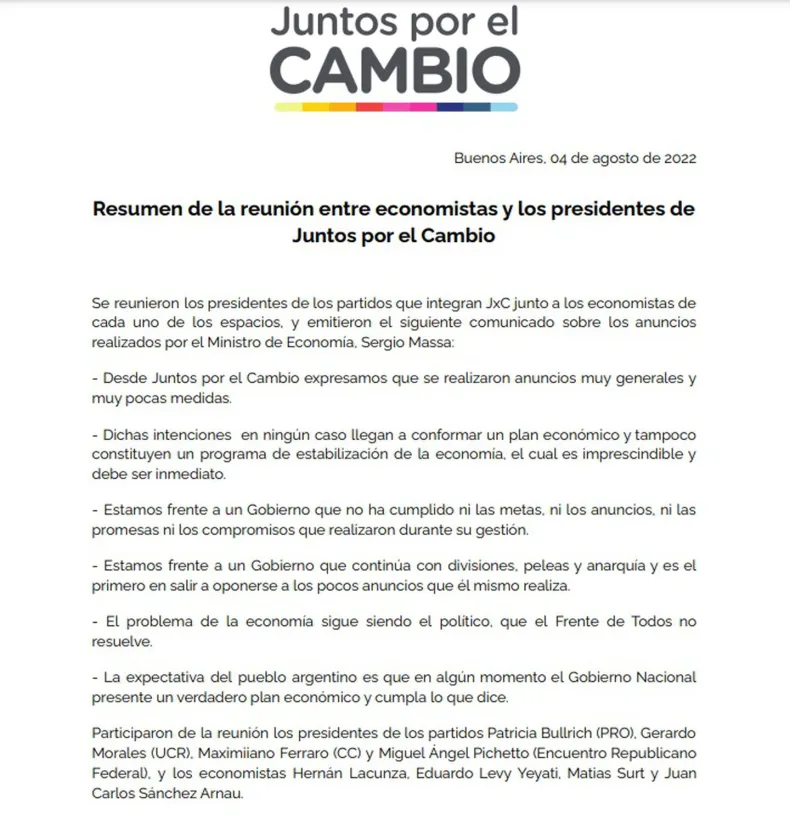 "Expresamos que se realizaron anuncios muy generales y muy pocas medidas. Dichas intenciones en ningún caso llegan a conformar un plan económico y tampoco constituyen un programa de estabilización de la economía, el cual es imprescindible y debe ser inmediato", inicia el comunicado firmado por los presidentes de los partidos que integran el espacio.
