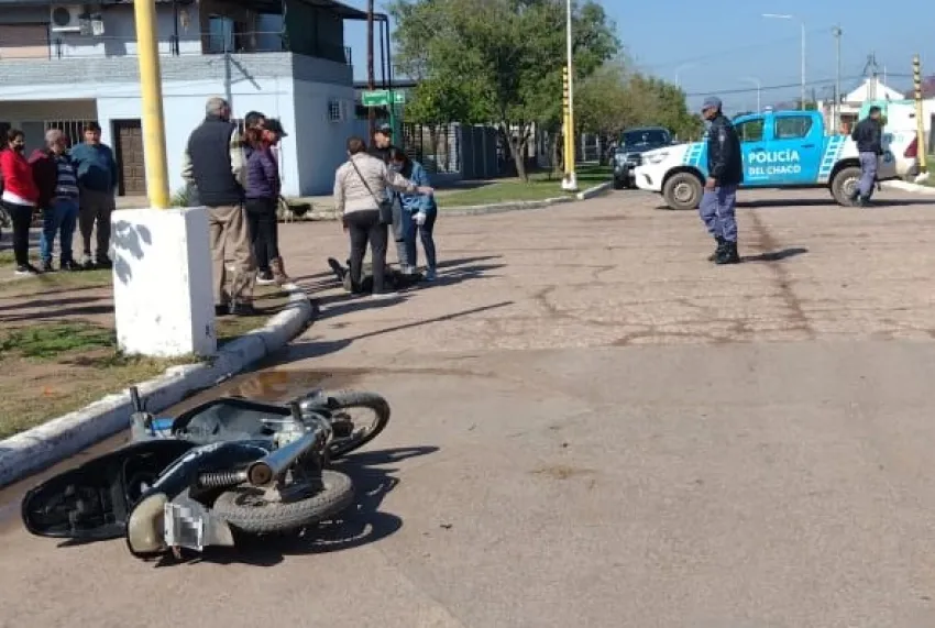 Este jueves ocurrió un choque entre una moto y un auto en Santa Sylvina. Fue entre las calles Sarmiento y Guillermo Della Savia.