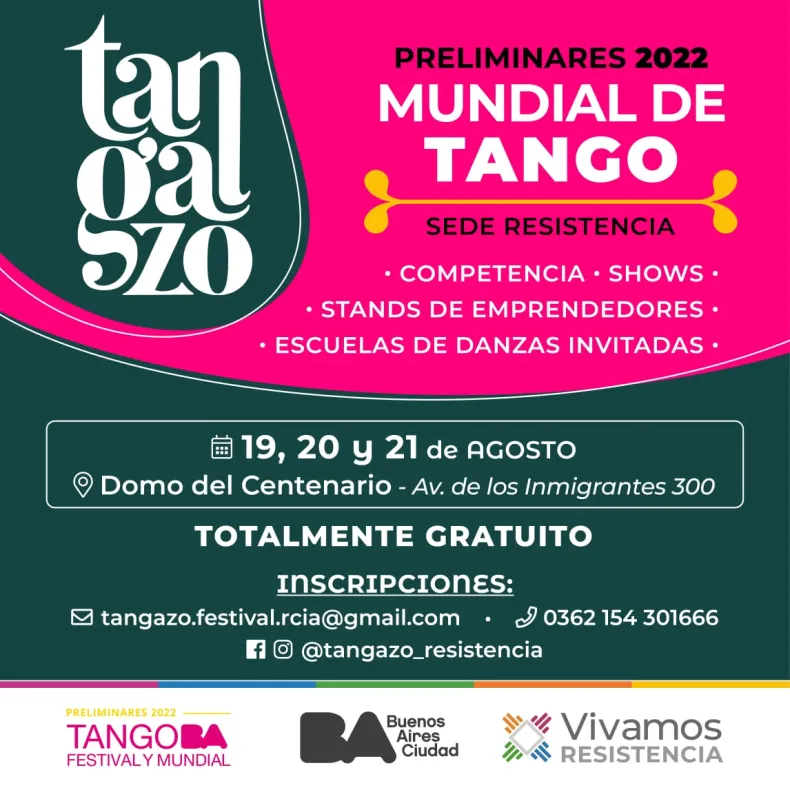 El Municipio de Resistencia recuerda que hasta el viernes 19 de agosto se encuentra abierta la inscripción para participar del "Tangazo", que consiste en un certamen preliminar del Mundial de Tango. El concurso se realizará el 19, 20 y 21 del mismo mes y tendrá lugar en el Domo del Centenario, siendo la inscripción y entrada, libre y gratuita.