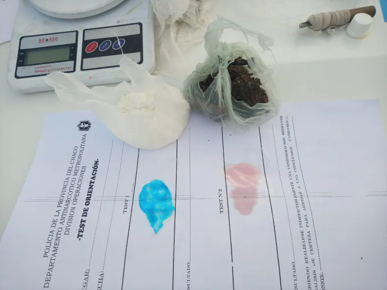 Seguidamente, se solicitó la presencia del personal del Departamento de Antinarcóticos y realizaron las pruebas contundentes, donde arrojó positivo para marihuana y cocaína. El pesaje total de la cocaína era de 49 gramos, mientras que el de la marihuana 30 gramos. También se le secuestró la motocicleta 110 cc y una suma de $17800 mil.