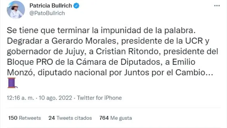 "Se tiene que terminar la impunidad de la palabra. Degradar a Gerardo Morales, presidente de la UCR y gobernador de Jujuy, a Cristian Ritondo, presidente del Bloque PRO de la Cámara de Diputados, a Emilio Monzó, diputado nacional por Juntos por el Cambio", comentó y continúo con la larga lista de nombres, entre los que se encuentran "Rogelio Frigerio, diputado nacional por el PRO y candidato de JxC en Entre Ríos, a Gerardo Milman, vicepresidente del Bloque PRO en la Cámara de Diputados, y a Facundo Manes, diputado nacional por la UCR, para defender posiciones de poder de su fuerza, no es aceptable", sentenció.