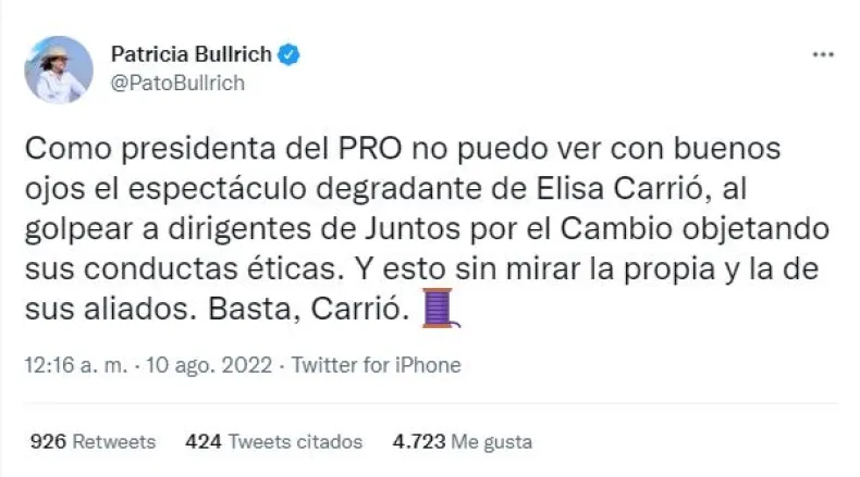 "Como presidenta del PRO -no puedo ver con buenos ojos el espectáculo degradante- de Elisa Carrió, al golpear a dirigentes de Juntos por el Cambio objetando sus conductas éticas. Y esto sin mirar la propia y la de sus aliados" señaló y le dejó una advertencia: "Basta, Carrió".
