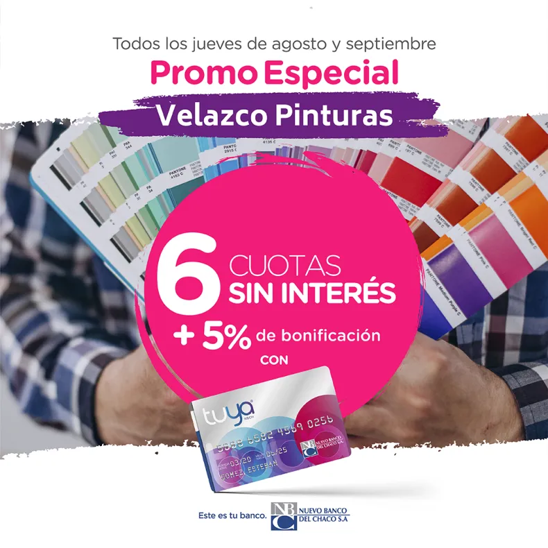 Tuya, marca propia de Nuevo Banco del Chaco, tendrá los jueves de agosto y septiembre una promoción para comprar en cuotas sin interés y reintegros en los locales adheridos de Velazco Pinturas.