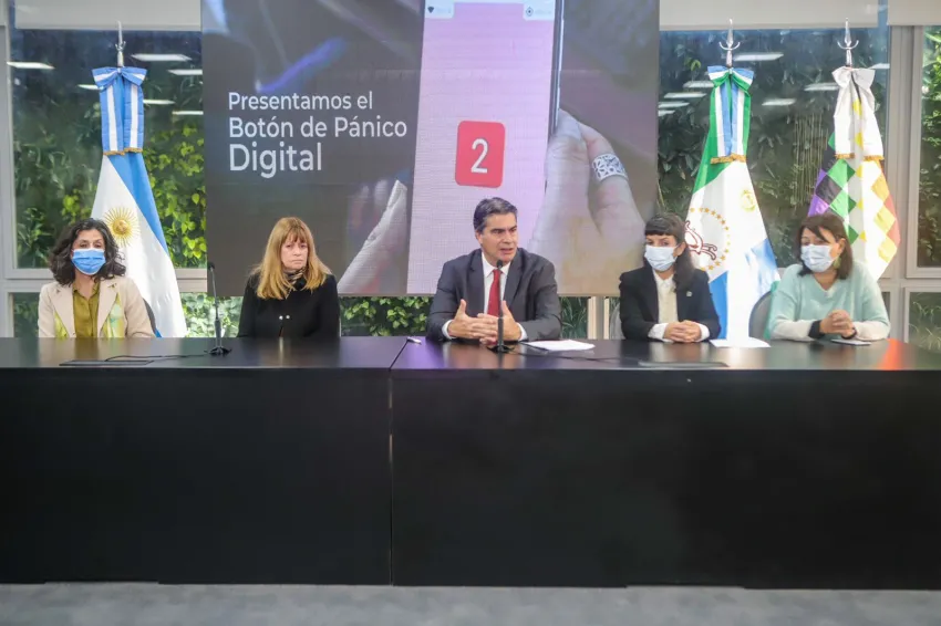 El gobernador Jorge Capitanich y la vicegobernadora Analía Rach Quiroga, junto a las autoridades del Superior Tribunal de Justicia, presentaron esta mañana en el Salón Obligado de Casa de Gobierno la aplicación para celulares "Botón de Pánico Digital". Se trata de una herramienta tecnológica de vanguardia para la protección de quienes enfrentan situaciones de violencia por razones de género, como complemento del sistema analógico de Botones de Pánico que se encuentra vigente.