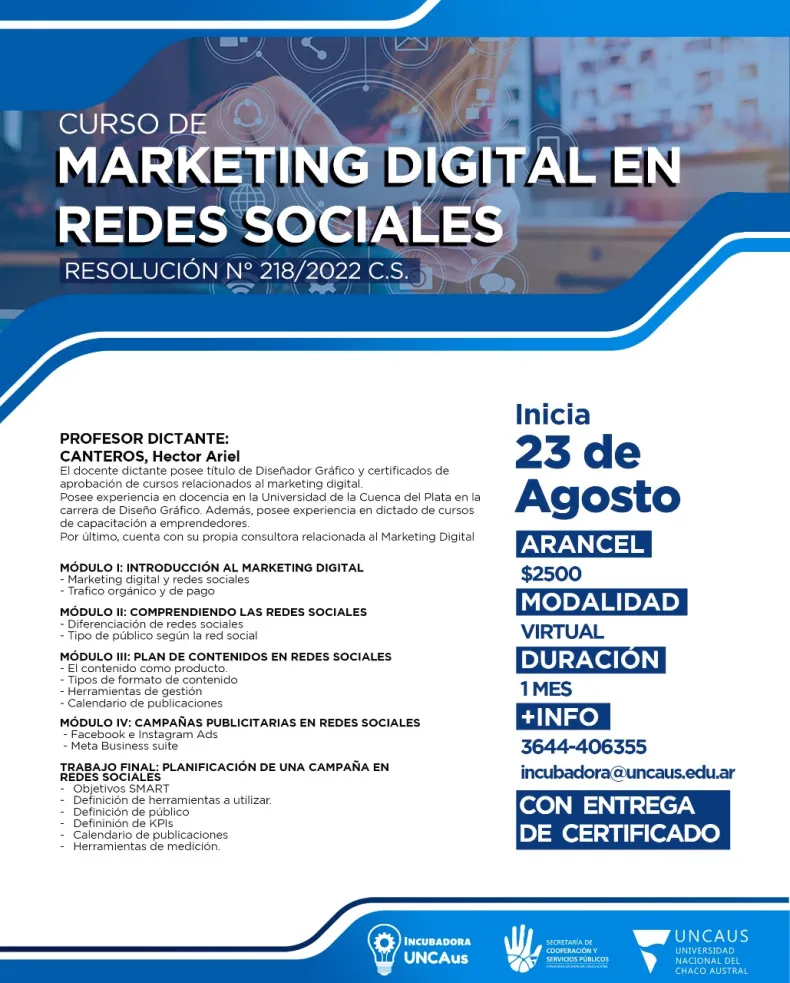 El docente, Héctor Ariel Canteros, desarrollará los siguientes módulos: introducción al marketing digital; comprendiendo las redes sociales; plan de contenidos en redes sociales; campañas publicitarias en redes sociales; y planificación de una campaña en redes sociales.