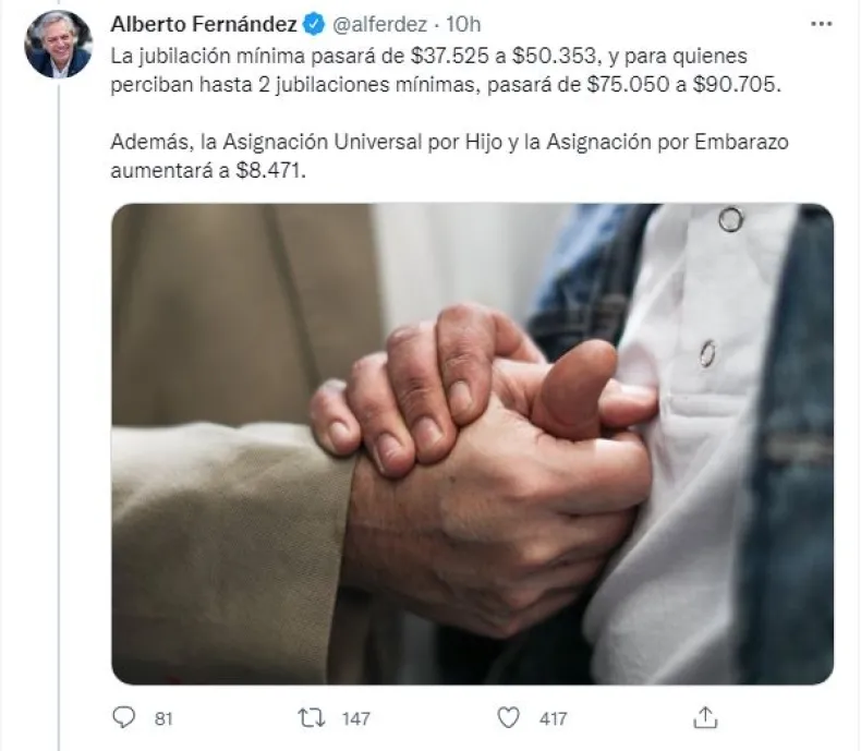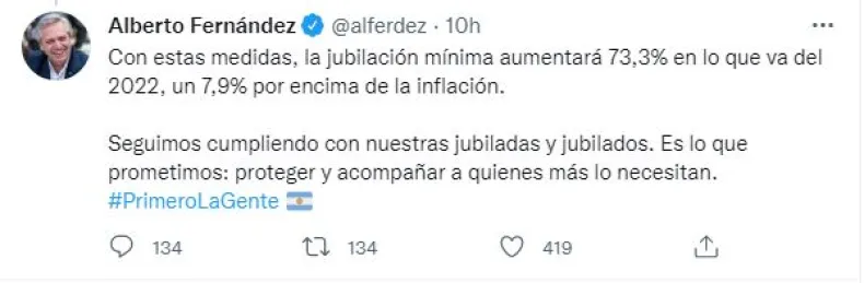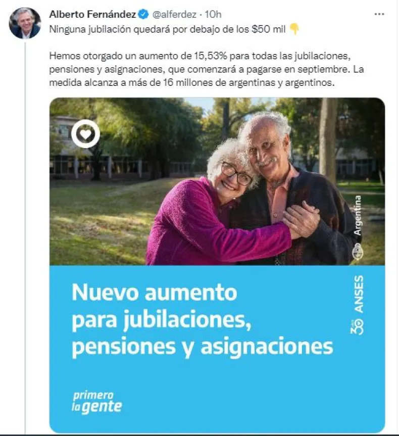 "Ninguna jubilación quedará por debajo de los $50 mil. Hemos otorgado un aumento de 15,53% para todas las jubilaciones, pensiones y asignaciones, que comenzará a pagarse en septiembre. La medida alcanza a más de 16 millones de argentinas y argentinos", escribió Fernández en Twitter.