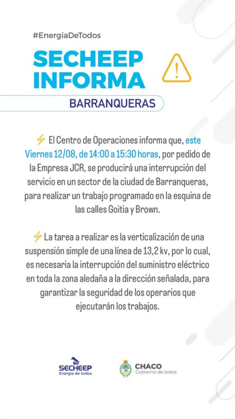 En la jornada de hoy viernes 12 de agosto, el Centro de Operaciones informó que en el trayecto de 14 a 15:30 horas y por pedido de la empresa JCR se producirá un corte de energía en un sector de la localidad de Barranqueras.