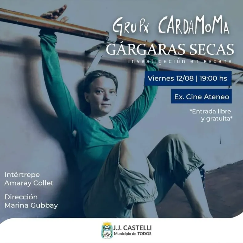 Por la tarde de hoy viernes se hará la representación de un unipersonal a cargo de Amaray Collet a partir de las 19 horas en el mismo Lugar. La obra "Gárgaras Secas" tiene un tinte autobiográfico y expresa su vida por estos lares castelenses. La entrada es Libre y gratuita.