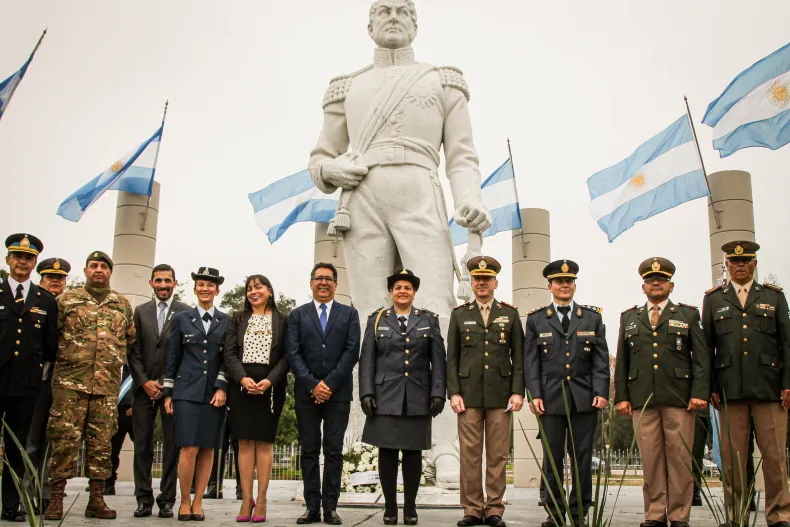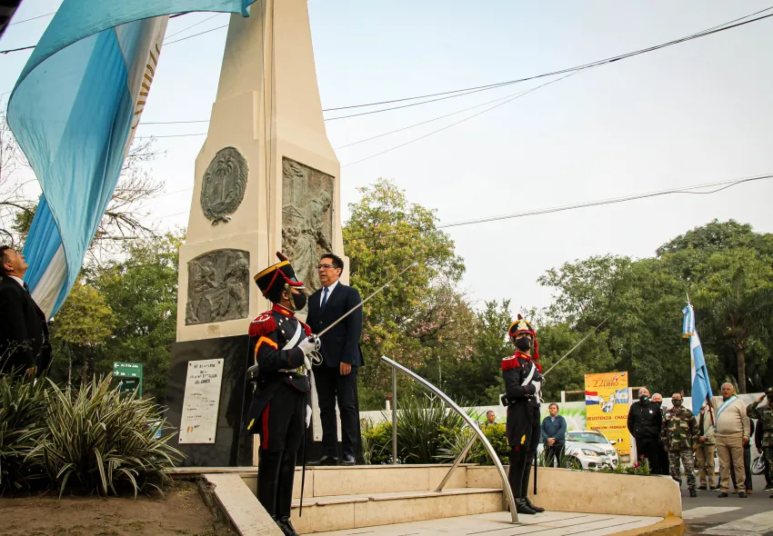 El intendente llevó a cabo el izamiento de banderas en el Mástil Mayor y luego, junto a autoridades municipales, provinciales, de las distintas fuerzas armadas y de seguridad presentes, remarcó la trascendencia de la recuperación integral del monumento en homenaje a San Martín ubicado en el ingreso al Aeropuerto Internacional Resistencia, donde además el Municipio colocó las "máximas sanmartinianas".