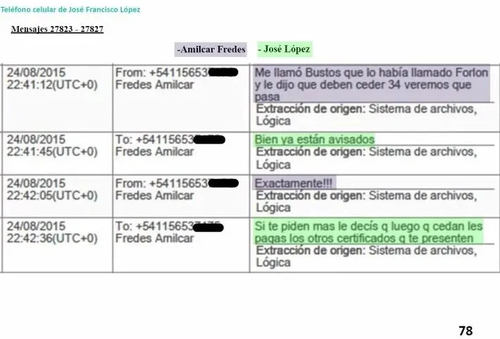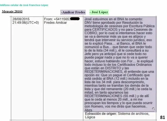 El mensaje continuaba: "Eso explico Pasa… (por Pasacantando uno de los imputados e integrante de Vialidad Nacional) al Banco, el BNA comunicó a Bus (por Claudio Bustos, apoderado de Austral) que tienen que ceder todo lo de la lista (34 mi), él le consultará a su Jefe (Lázaro Báez) pero ya anticipó que si cede todo no puede pagar nada y que no lo va a querer hacer, estuve hablando con For (Juan Forlon, amigo de Máximo Kirchner y presidente del Banco Nación) le expliqué todo incluso lo de los Certificados Ordinarios que están en DISTRITO y las REDETERMINACIONES, el entiende que una opción es: Que yo paque el Certificado que está cedido al BNA (12 mill) incluido en la lista de los 34 mill para descomprimirlo, mientras tanto se tramitan los demás de la lista y que del remanente (20 mill) le ceda la mitad, en tanto apuramos las REDETERMINACIONES (55 mill) y de allí que le ceda al menos 20 mill, a mí me preocupan los tiempos".